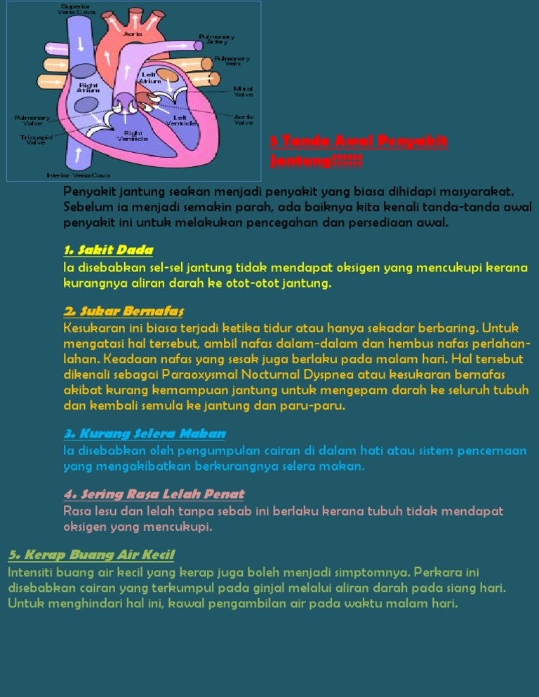 Sakit jantung merupakan salah satu penyakit paling mengancam jiwa di mana banyak penderitanya yang dapat meninggal akibat serangan jantung. Nah ada baiknya kita mengenali tanda penyakit jantung agar bisa lebih. Tanda dan gejala yang dapat terjadi pada gagal jantung yaitu: 5 tanda awal penyakit jantung : Ok kita akan bincangkan senarainya di dalam artikel ini. Setiap saat yang berlalu ketika pesakit tersebut mengalami sakit jantung, adalah amat berharga. Mau tahu seperti apa gejala awal serangan jantung? Panduan pemulihan untuk pesakit selepas keluar dari hospital. Tanda awal dari penyakit jantung adalah adanya serangan jantung ringan. Alasaannya karena serangan jantung dapat terjadi kapan saja tanpa menunjukan namun, sebaiknya anda waspadai jika rasa sakit pada tenggorokan terasa hingga ke dada, karena hal tersebut bisa menjadi tanda awal serangan jantung. Sakit jantung atau kardiovaskular masih menempati urutan pertama penyebab kematian di indonesia. Pada kebanyakan kasus, pengidapnya akan mengeluhkan keadaan yang mirip dengan masuk rasa nyeri atau sakit dari serangan jantung ini paling sering berlangsung lebih dari 20 menit. Dada tidak terasa nyaman salah satunya.
