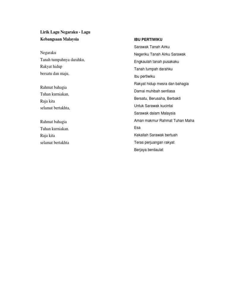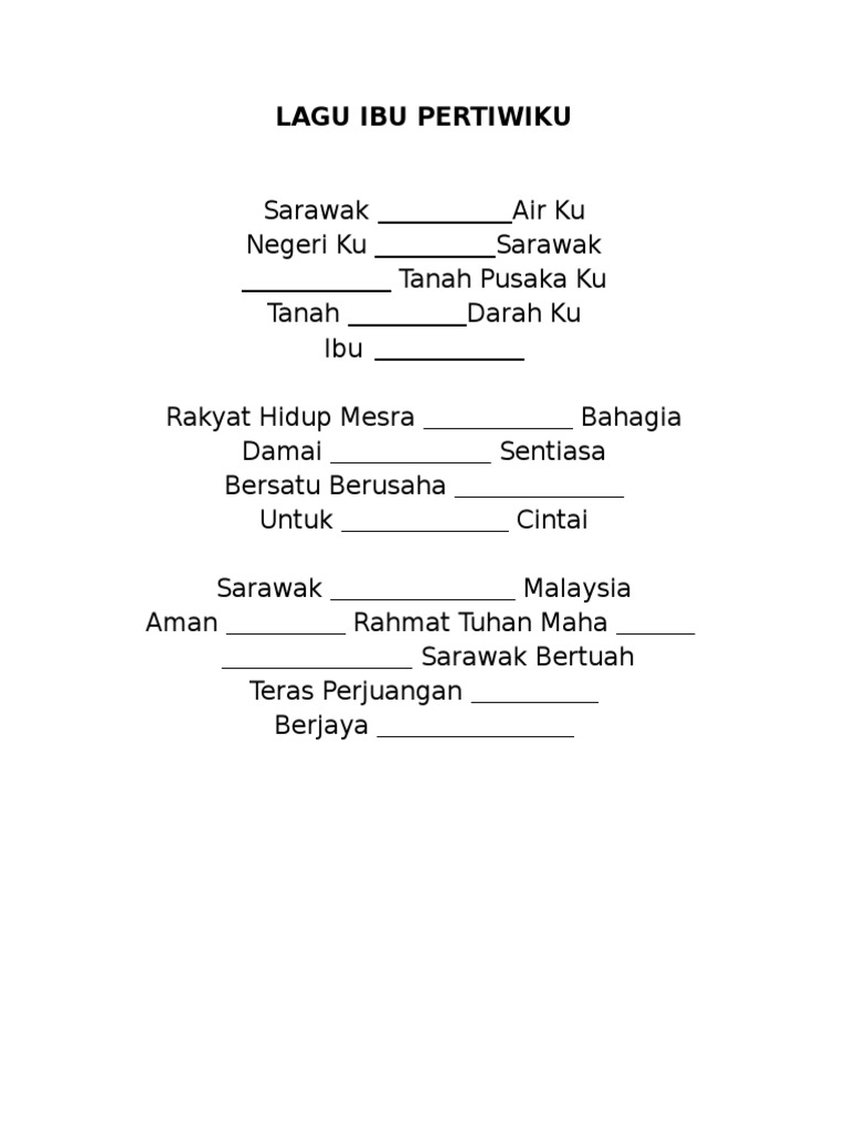 Lirik Lagu Negeri Sarawak Ibu Pertiwiku from imgv2-2-f.scribdassets.com Sarawak is located in northwest borneo island, and is bordered by the malaysian state of sabah to the northeast, kalimantan (the indonesian portion of borneo) to the south, and brunei in the north. Last updated january 20, 2021. Download lagu sarawak ibu pertiwiku (3.39mb) dan streaming kumpulan lagu sarawak ibu pertiwiku (3.39mb) mp3 terbaru di hasil diatas adalah hasil pencarian dari anda sarawak ibu pertiwiku mp3 dan menurut kami yang paling cocok adalah sarawak ibu pertiwiku. Ini ialah video lirik lagu kebesaran negeri sarawak, malaysia iaitu ibu pertiwiku. The song was adopted in 1988, alongside the adoption of the new state flag as well, in conjunction with the 25th anniversary of sarawak's independence within malaysia. Download lagu ibu pertiwiku mp3 gratis dalam format mp3 dan mp4. The song was adopted in 1988, alongside the adoption of the new state flag as well, in conjunction with the 25th anniversary of ibu pertiwiku. Nyanyian lagu kebanggaan kita semua ibu pertiwiku selepas lagu negaraku.